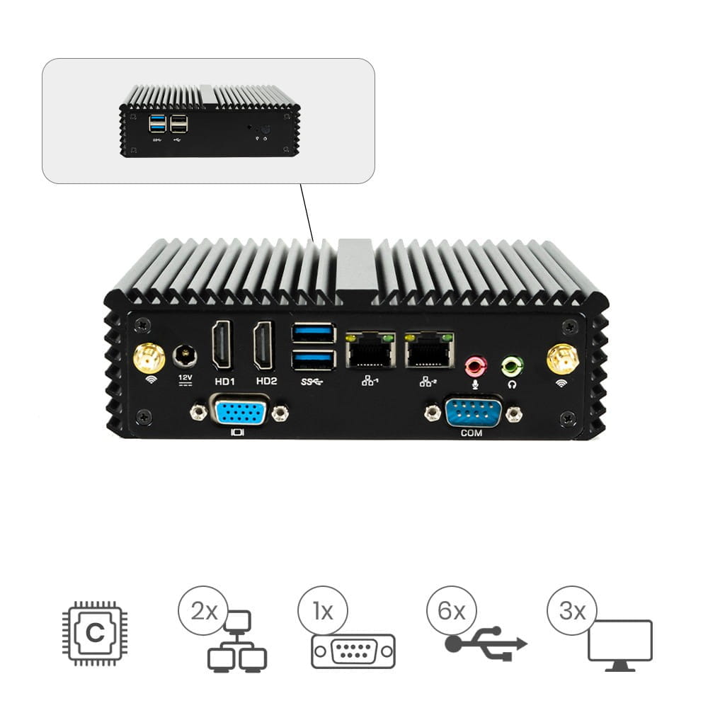 Cuenta con un procesador Celeron J13160 de bajo consumo integrado, tarjetas de red duales Gigabit + WIFI, doble salida HDMI y una de VGA, 6 salidas USB (4 de ellas USB 3.0) y una salida RS232.