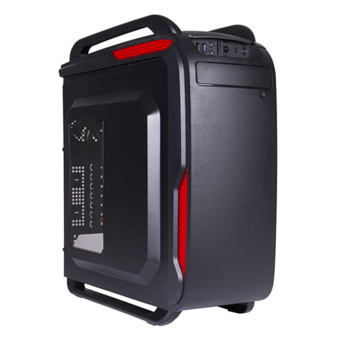 Tanto la parte frontal como la superior están rematadas con materiales plásticos en color negro con acabado rugoso. A estas le acompañan rejillas laterales en color rojo para facilitar la entrada de aire exterior. En la parte frontal localizamos un acceso abatible para la unidad óptica de 5.25” y sobre esta el panel frontal de conexiones. En este localizamos dos puertos USB 3.0., un puerto USB 2.0., conectores de audio para micrófono y auricular, lector de tarjetas SD y micro SD, botones de encendido, reset y selector de velocidad para ventiladores.