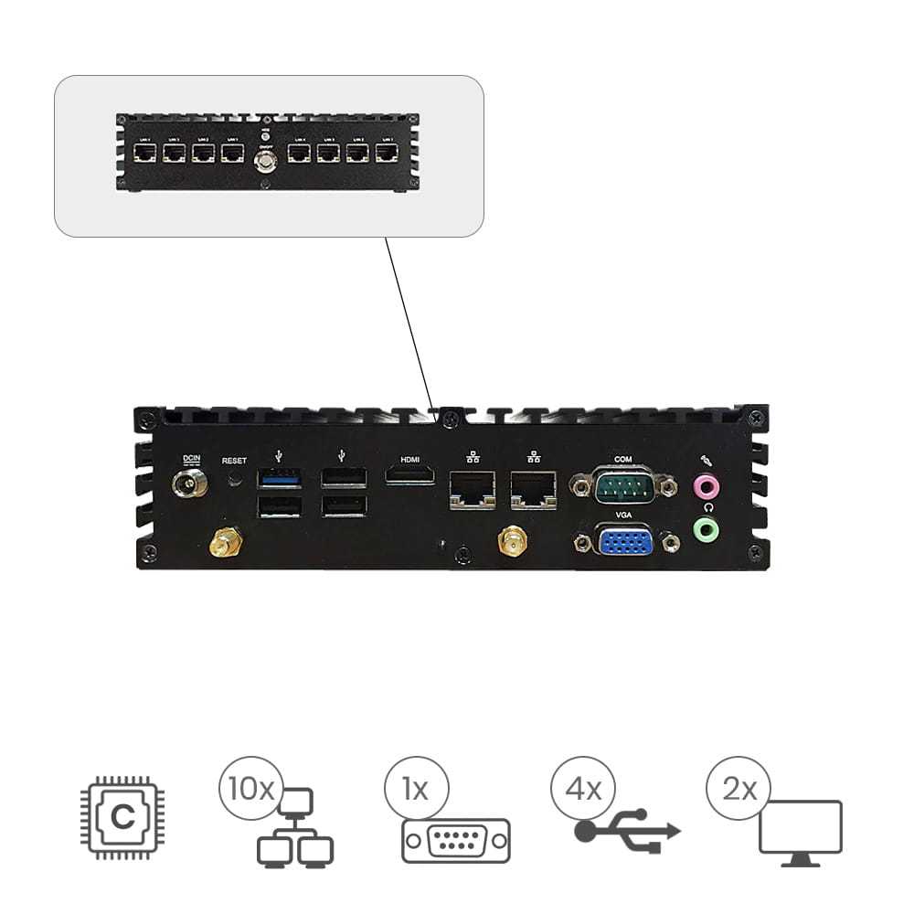The Appliot P415-CE04A-J1900 Bay Trail 10-LAN Network Pro is a fanless mini PC designed specifically for environments requiring advanced network management and low power consumption. Equipped with an Intel Celeron J1900 processor, this device offers an efficient and stable solution for network applications, firewalls, communication servers and surveillance systems. Its fanless design ensures silent and maintenance-free operation, ideal for environments where reliability and low power consumption are essential.