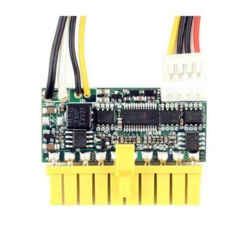 It is compatible with all Mini-ITX motherboards. It connects directly to the power connector of the 20-pin Plug board.