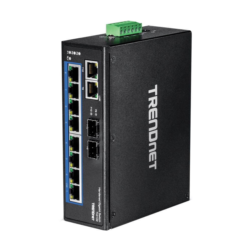 The TRENDnet 10-port Heavy Duty Industrial DIN-Rail Gigabit Switch, Model TI-G102, features eight dedicated gigabit ports plus two shared gigabit RJ-45 / SFP ports. Users can connect up to eight devices to the switch, while providing two gigabit ports for additional network connections. It is equipped with an IP30-rated metal housing, designed to tolerate high levels of vibration and shock, capable of operating over a wide temperature range, from -40 to 75 ° C (-40 to 167 ° F), for industrial environments .
