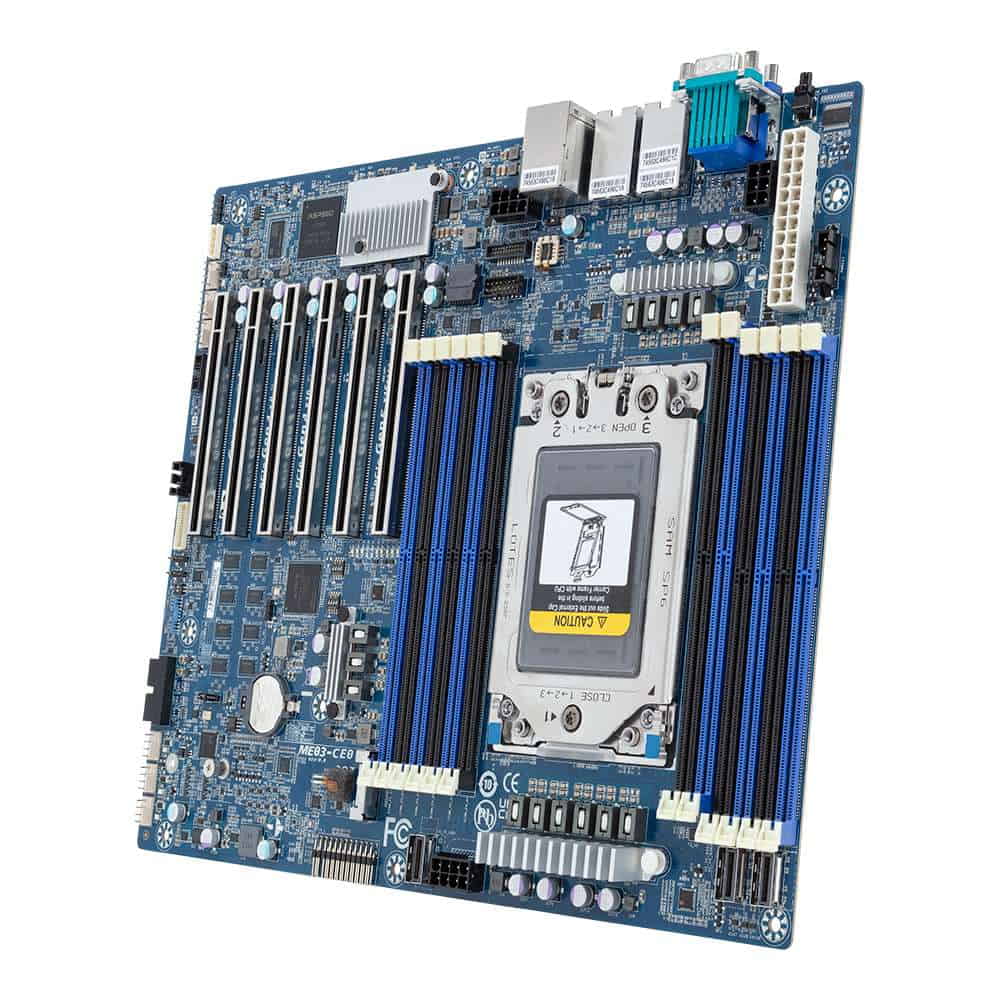La placa base Gigabyte ME03-CE0, diseñada para servidores, incorpora la última tecnología para satisfacer las demandas de los entornos de computación más exigentes. Equipada con procesadores AMD EPYC™ 8004 Series y utilizando tecnología de 5nm, esta placa base de factor de forma ATX es capaz de manejar hasta 64 núcleos y 128 hilos, lo que la convierte en una opción poderosa para aplicaciones que requieren un alto rendimiento de procesamiento.