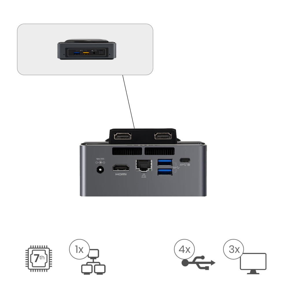 Incrementa la productividad a un coste tan reducido como su tamaño, ideal para entornos de oficina, incorporado a soluciones de cartelería digital y salas de video conferencia gracias a su diseño ultra silencioso y una potente configuración (Intel i5-7260U, 8Gb RAM DDR4, 120Gb SSD M.2) proporciona un gran rendimiento para cualquier tipo de aplicación.