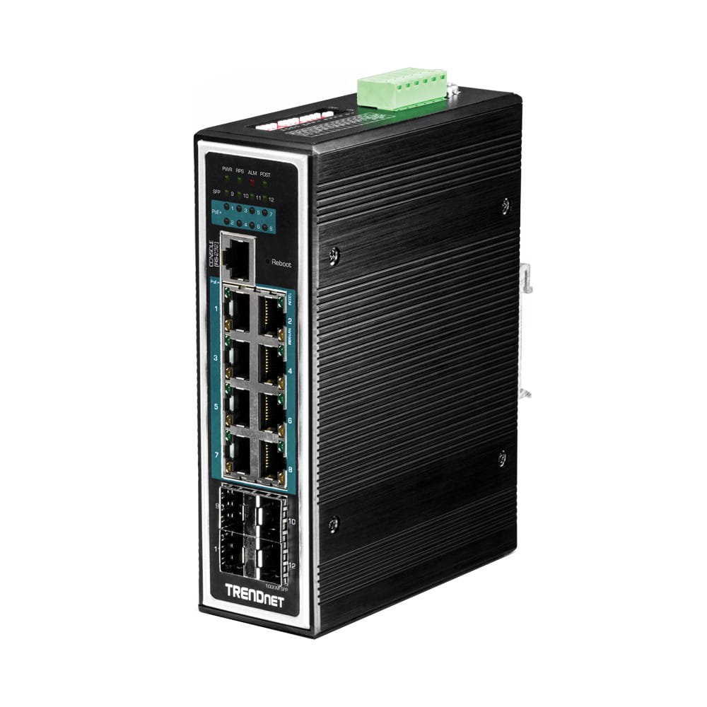 El switch DIN-Rail administrado de capa 2+ PoE+ Gigabit industrial reforzado de 12 puertos de TRENDnet, modelo TI-PG1284i, cuenta con ocho puertos Gigabit PoE+, cuatro ranuras Gigabit SFP y una potencia PoE disponible de 240 vatios. Está equipado de una carcasa de metal con clasificación IP30 y concebido para soportar un alto grado de vibraciones e impactos, con protección contra descargas electrostáticas / interferencias electromagnéticas / sobretensiones; funciona en un amplio intervalo de temperaturas [de - 40 a 75 °C (de - 40 a 167 °F)] para condiciones extremas. La administración L2+ abarca funciones como el control de puertos PoE, VLAN 802.1Q / Q-in-Q, multidifusión, spanning tree, agregación de enlaces, QoS, enrutamiento de IPv4 / IPv6 estática, ACL y 802.1X, las cuales ofrecen una gran flexibilidad para la integración de la red.